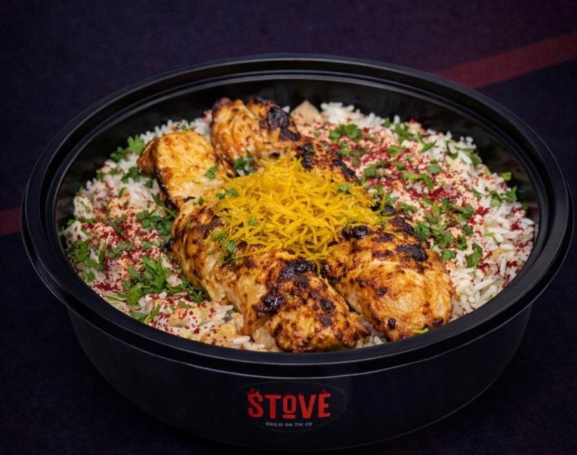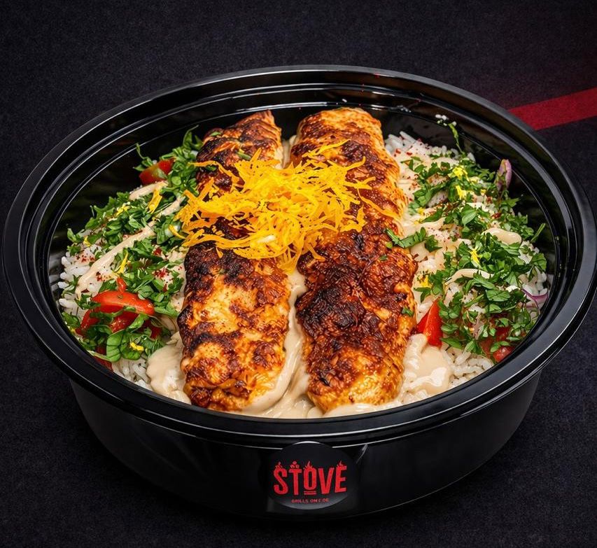 .طبق مكون من طبقة من الأرز وكباب الدجاج مع صوص الكوكتيل والطحينة